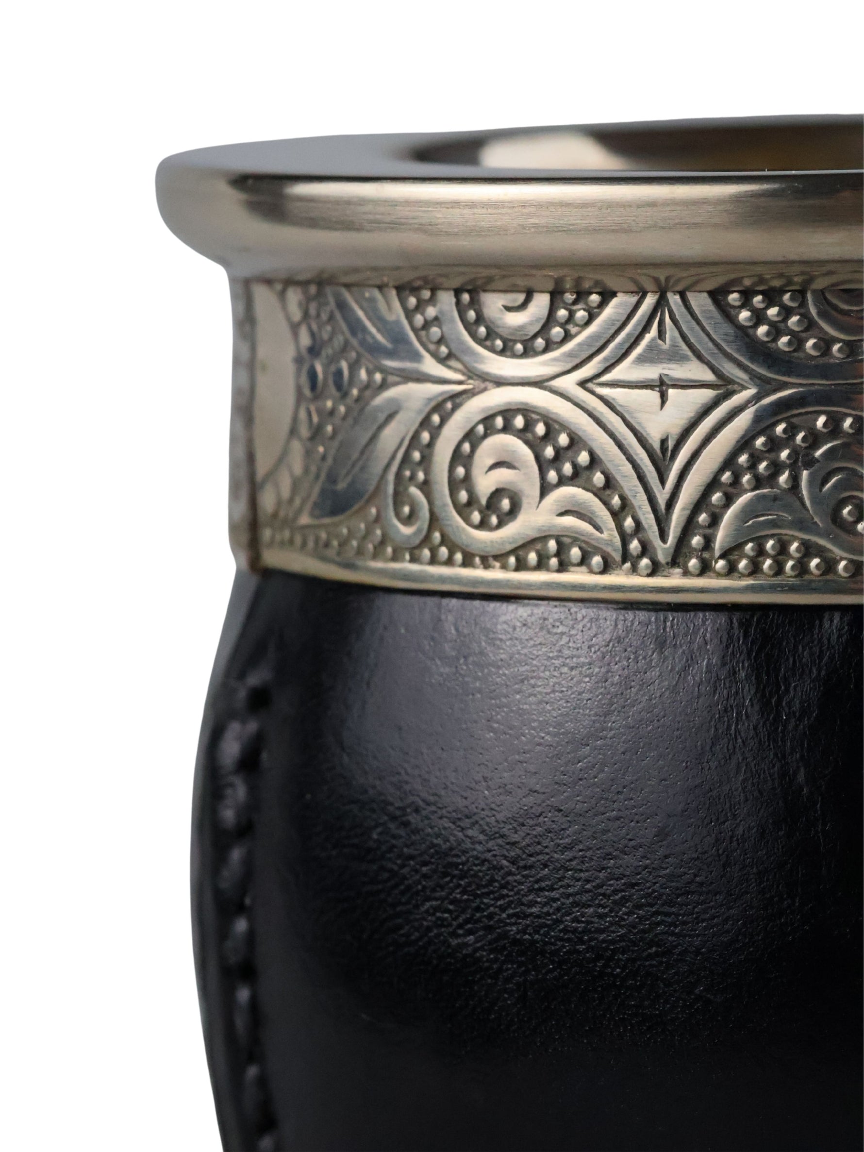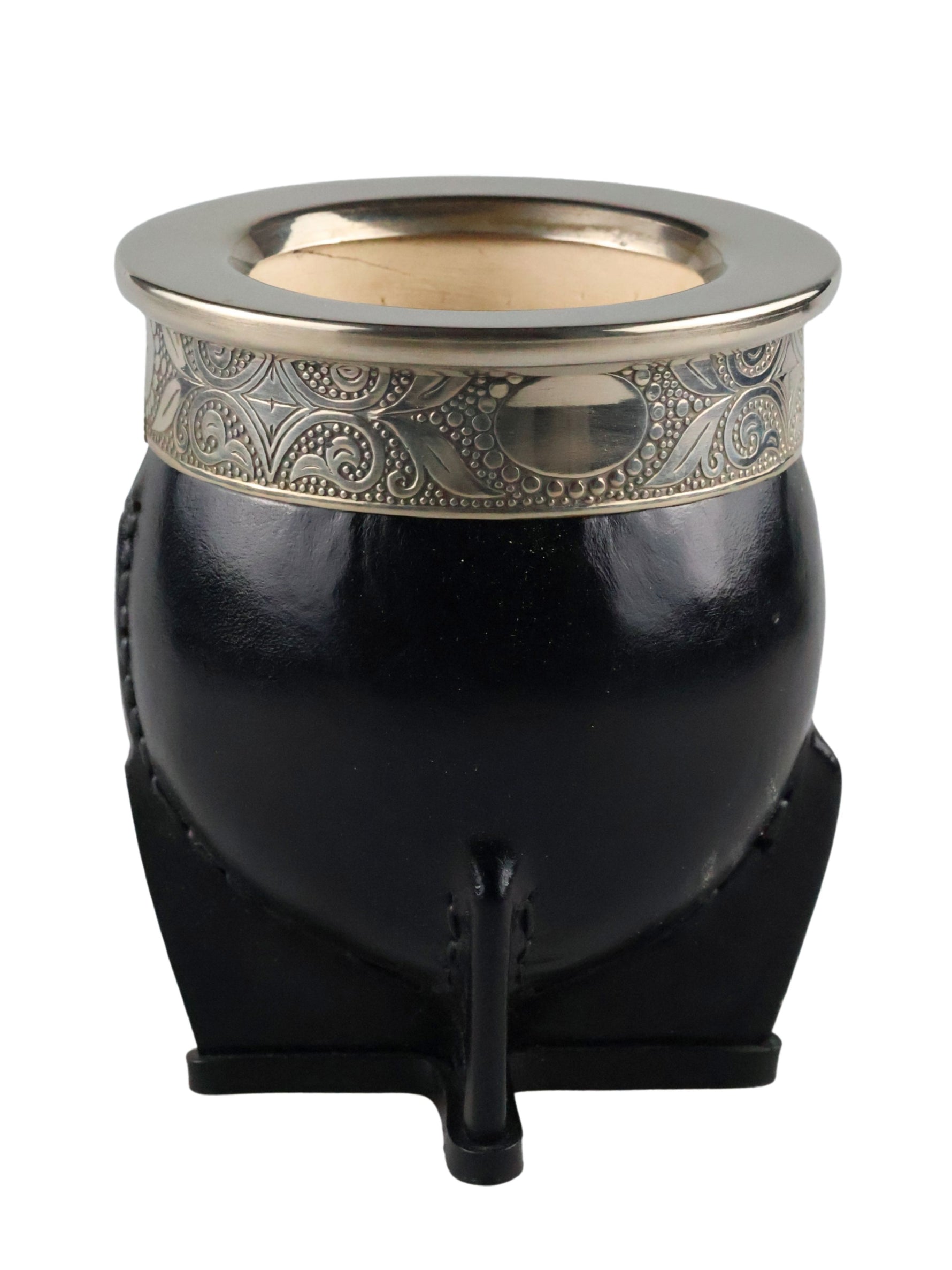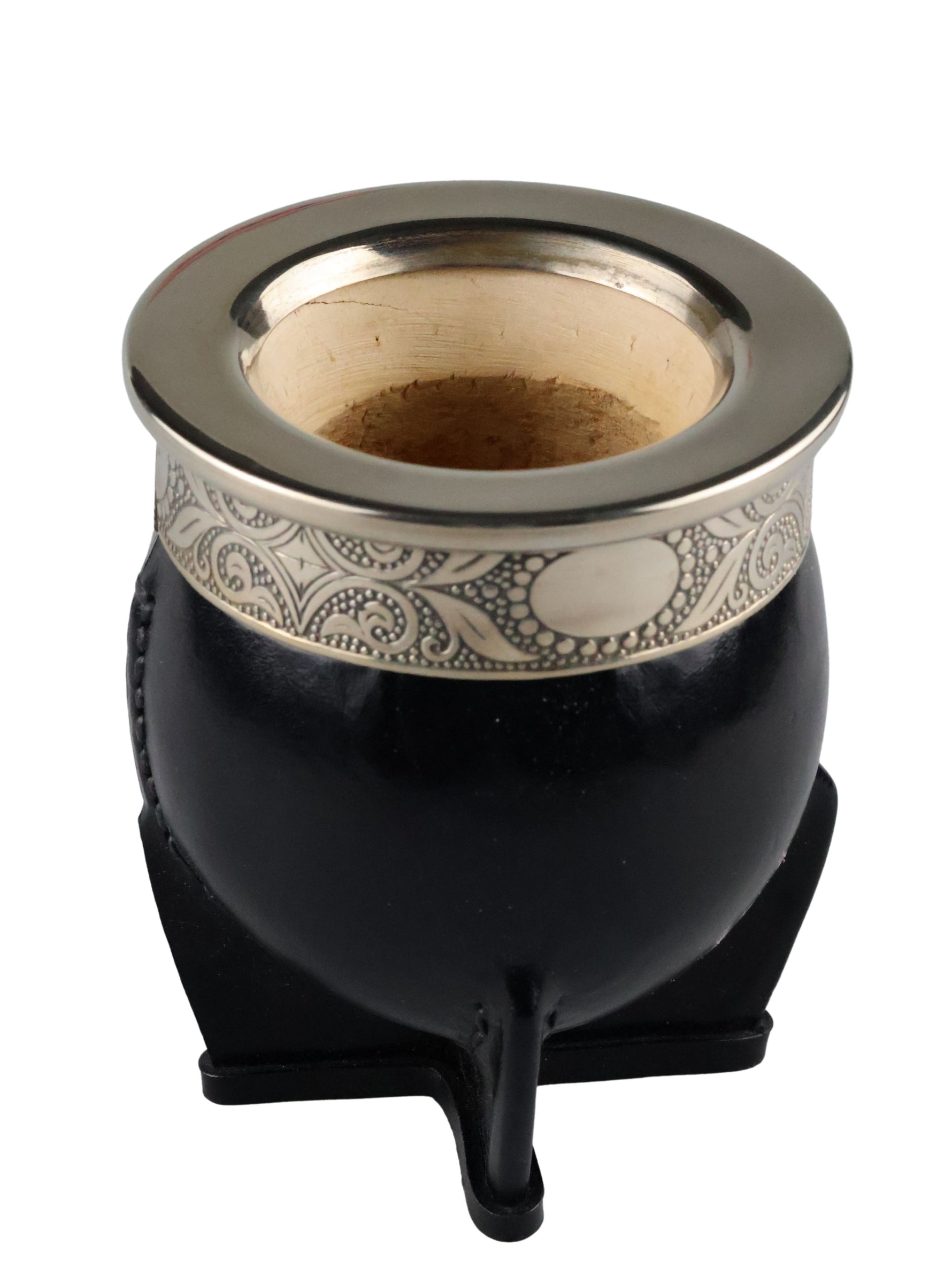 Dit product is handgemaakt door ervaren ambachtslieden in een afgelegen dorpje in Argentinië. Het bestaat uit een natuurlijk verbouwde kalebas (een soort pompoen) die wordt gewikkeld in speciaal leer. De ring is gemaakt van Duits zilver; een legering van nikkel, koper en zink, en voorzien van schitterende versieringen.