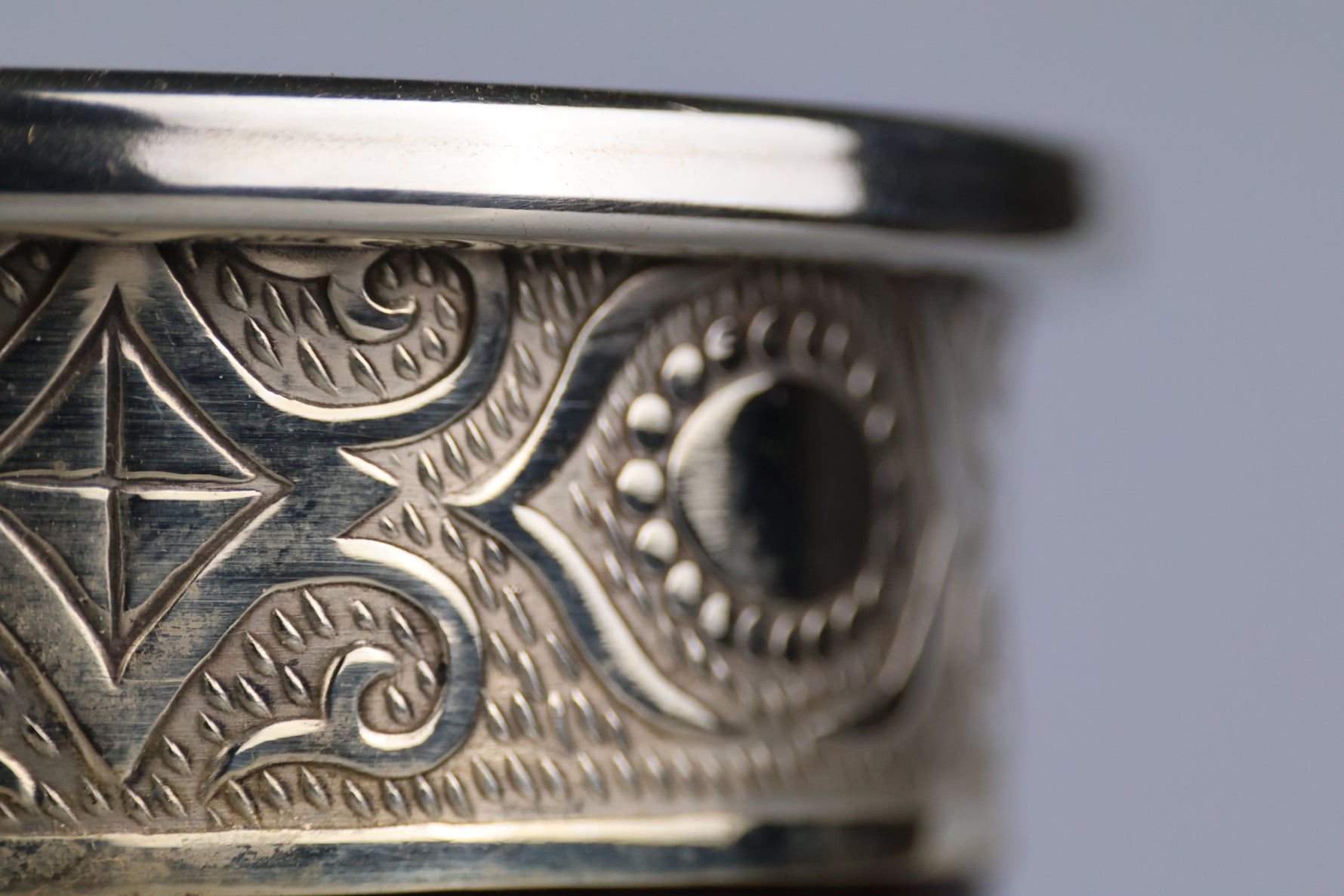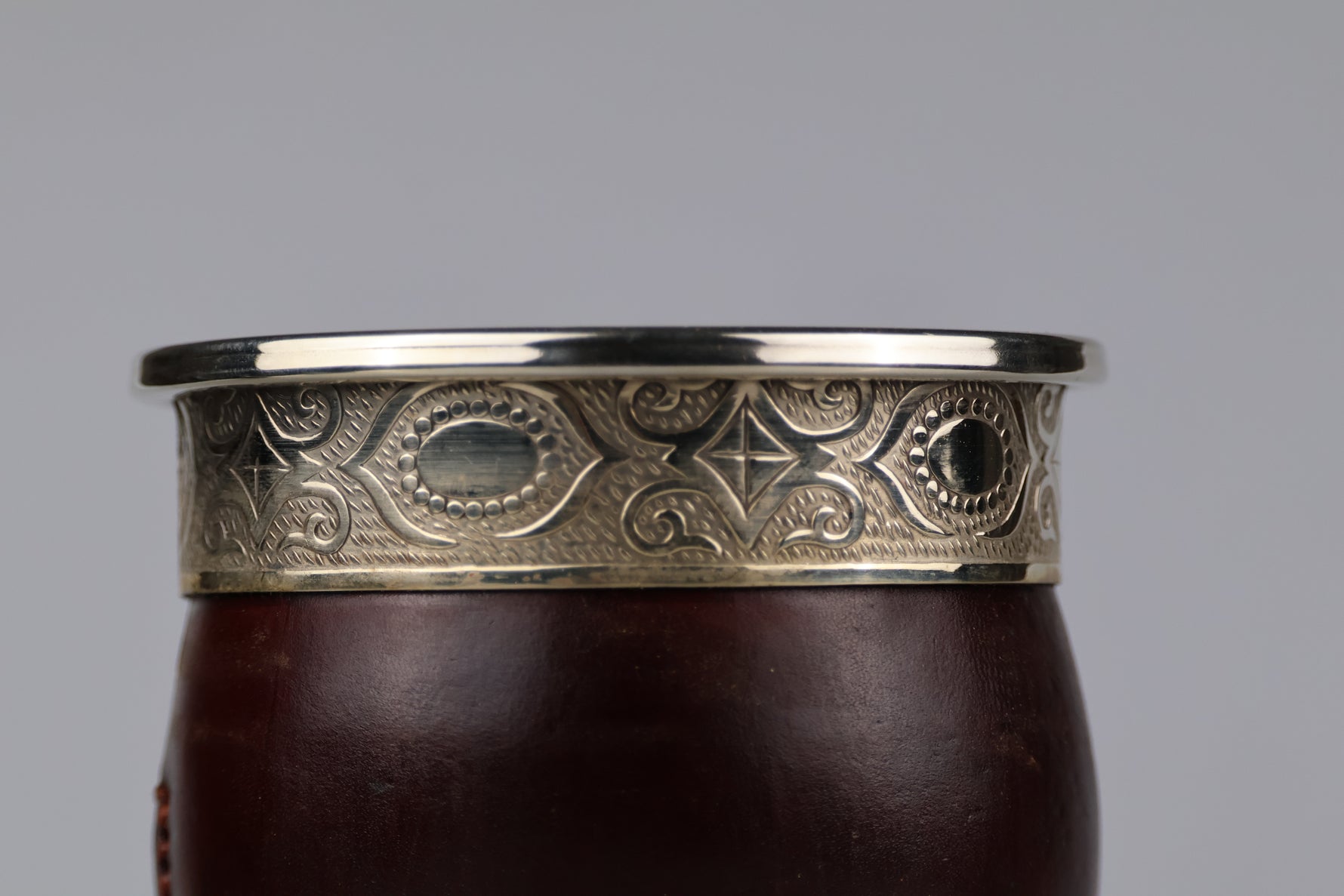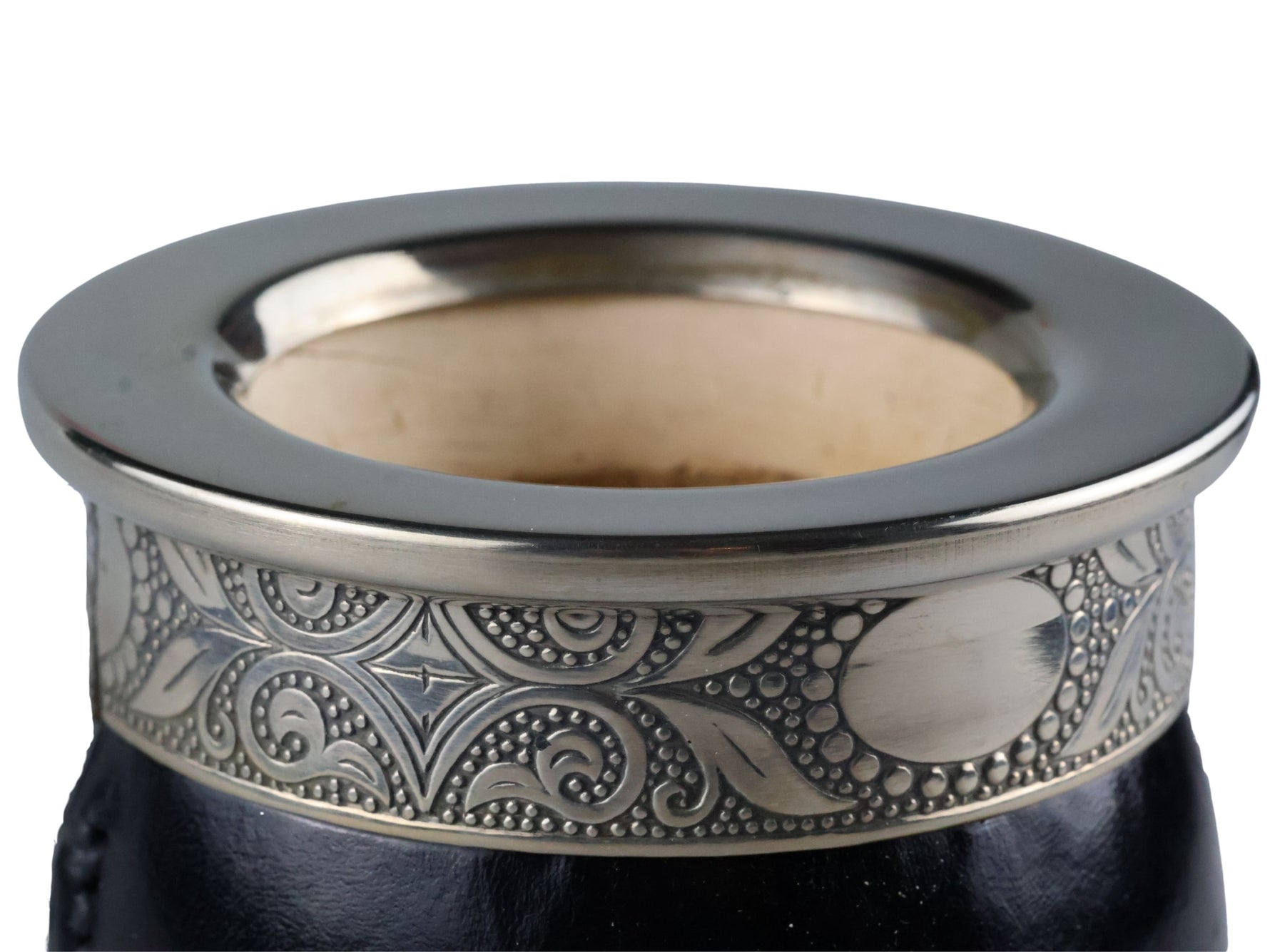 Dit product is handgemaakt door ervaren ambachtslieden in een afgelegen dorpje in Argentinië. Het bestaat uit een natuurlijk verbouwde kalebas (een soort pompoen) die wordt gewikkeld in speciaal leer. De ring is gemaakt van Duits zilver; een legering van nikkel, koper en zink, en voorzien van schitterende versieringen.