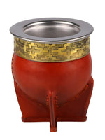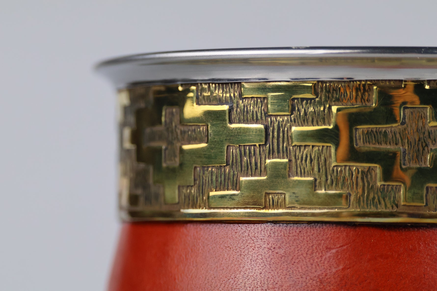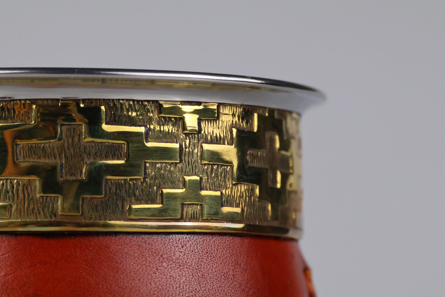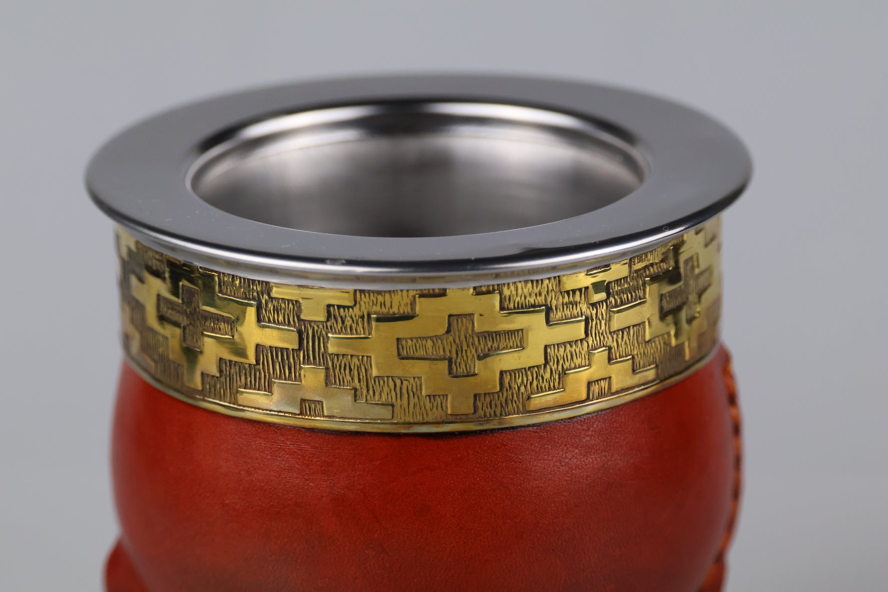 De beker heeft een binnenkant van RVS. Dit maakt dat deze kalebas niet hoeft te rijpen, en je ook geen risico loopt op schimmel. De buitenkant is bedekt met leer, en heeft een goudkleurig versierde ring.