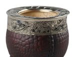 Een kalebas voor de kenner. De Martin Fierro Imperial Cincelada valt op door de combinatie van krokodillenleer in een warme, donkerbruine kleur en een breed geciseleerde alpaca ring met een gedetailleerd blad- en rankenmotief. De imperial vorm biedt een ruim volume en ligt comfortabel in de hand, terwijl de stevige leren voet voor stabiliteit zorgt.